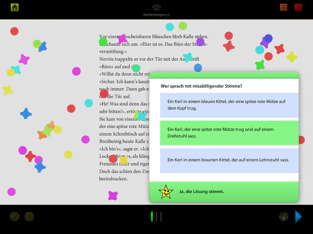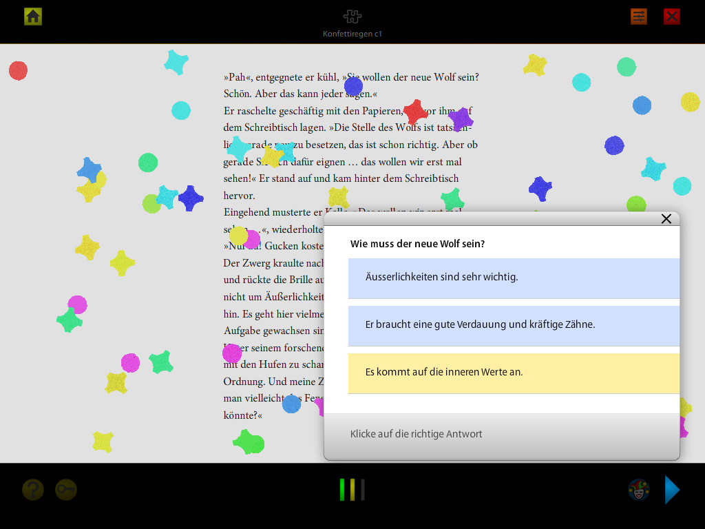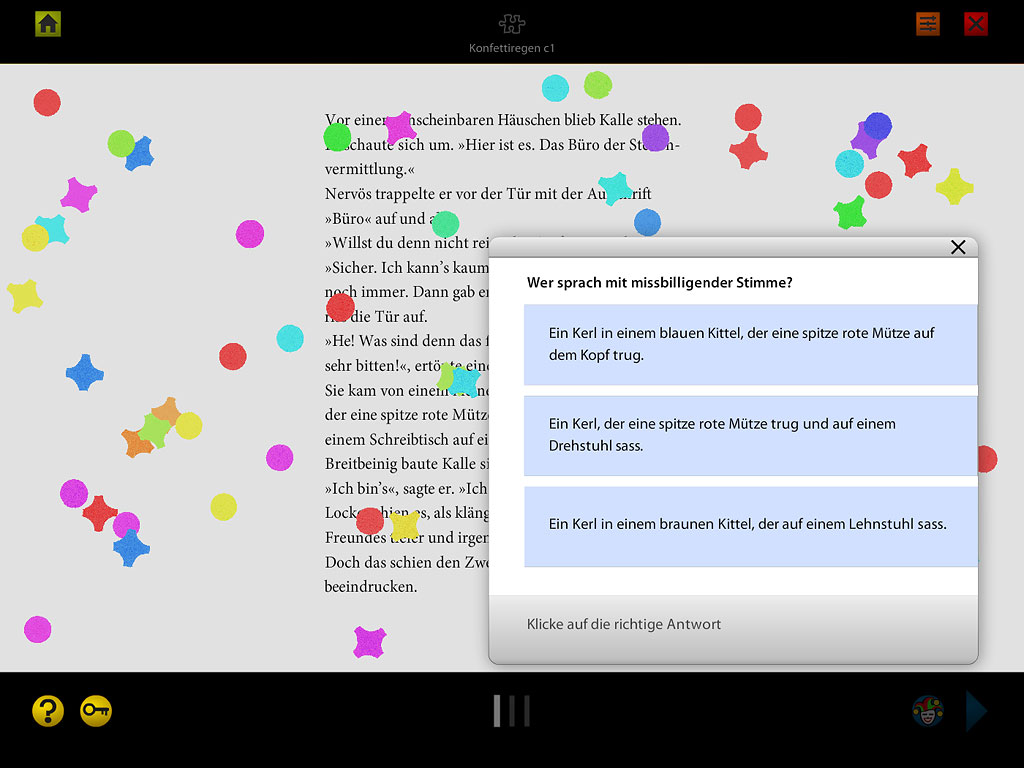 KontrolleNach Abschluss einer Aufgabe erscheint eine Palette, die in der Regel Kontrollfragen zum Textverständnis enthält. In diesem Beispiel muss die richtige Antwort angeklickt werden, daneben gibt es weitere Kontrollformate wie Bewertungen von Aussagen, Ordnungs- oder Sortieraufgaben. Die Kinder können die Kontrollpalette verschieben, um im Übungstext etwas nachzulesen. |
