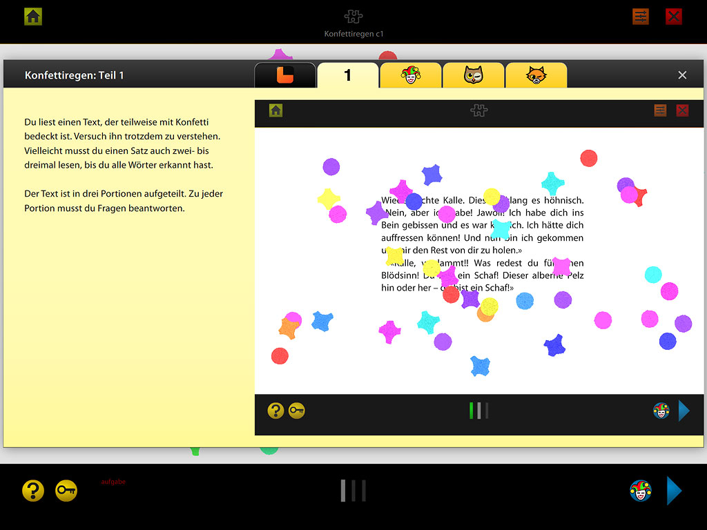 Aufgabe1Mit der ersten Aufgabe beginnt die eigentliche Übung. Die Kinder bearbeiten eine Leseaufgabe, die spezifisch auf einen Lernbereich und ein Lernziel ausgerichtet ist (eine Übersicht der Übungstypen finden Sie hier). Eine Aufgabe kann auch aus mehreren Teilaufgaben bestehen. |