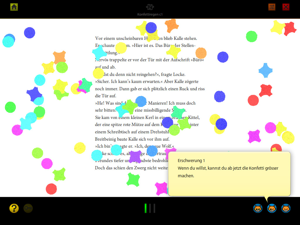 Wahl ErschwerungWenn die 1. Aufgabe auf Anhieb fehlerfrei gelöst wurde, können die Kinder mit den Fuchs-Tasten die Schwierigkeit der weiteren Aufgaben bestimmen (normal, +1 oder +2). Wer eine Übung mit Erschwerung erfüllt, erhält am Ende der Übung Bonuspunkte. |