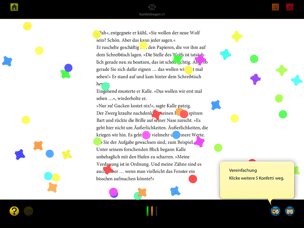 KontextIn der Lesewerkstatt werden manchmal Textausschnitte verwendet, die nicht ohne Kontextinformationen (z.B. über den Anfang einer Geschichte) verständlich sind. In diesem Fall werden vor dem Start des Programms solche Informationen gegeben. |