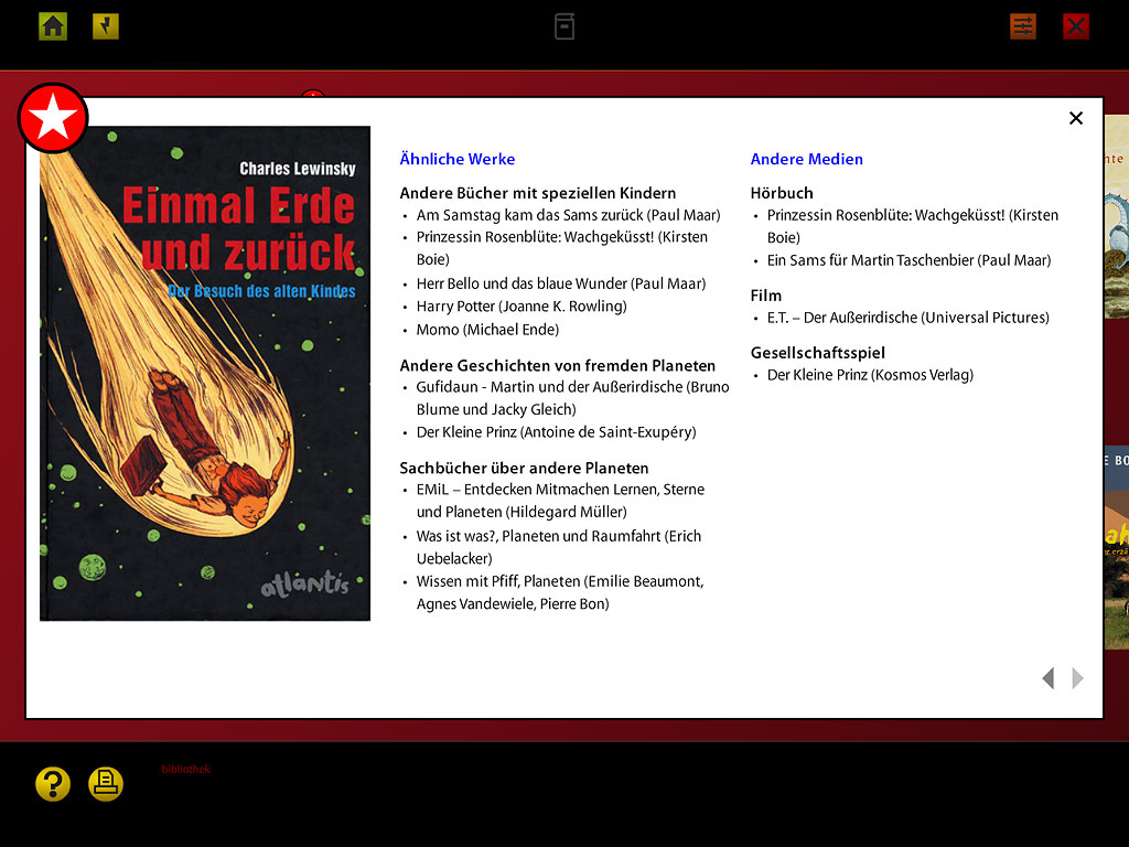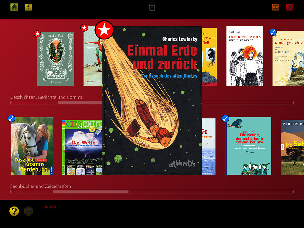 In der Bibliothek werden alle Texte der Lesewerkstatt aufbewahrt. Die Kinder können die einzelnen Buchcover anklicken, um zusätzliche Informationen über den Inhalt, den Autor/die Autorin und den Verlag zu erhalten. |