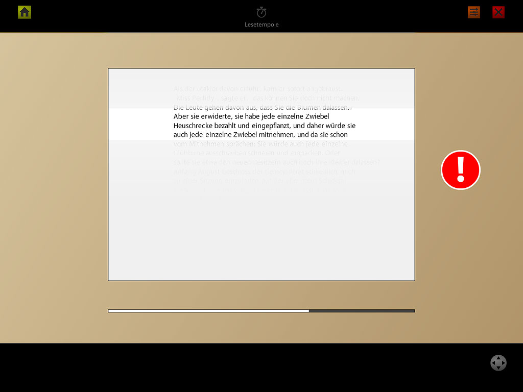 Lesetempomisst, wie schnell ein fortlaufender Text gelesen und verstanden wird. Zuerst wählen die Kinder anhand einer ersten Textportion ihr gewünschtes Lesetempo. Dann lesen sie eine zweite, längere Textportion mit eingestreuten Stolperwörtern (die nicht in den Text hineinpassen). Jedesmal, wenn sie auf ein Stolperwort stossen, betätigen sie den Alarmknopf. Die Leistung wird in Wörtern pro Minute ausgedrückt, wobei nicht erkannte Stolperwörter den Wert reduzieren. |