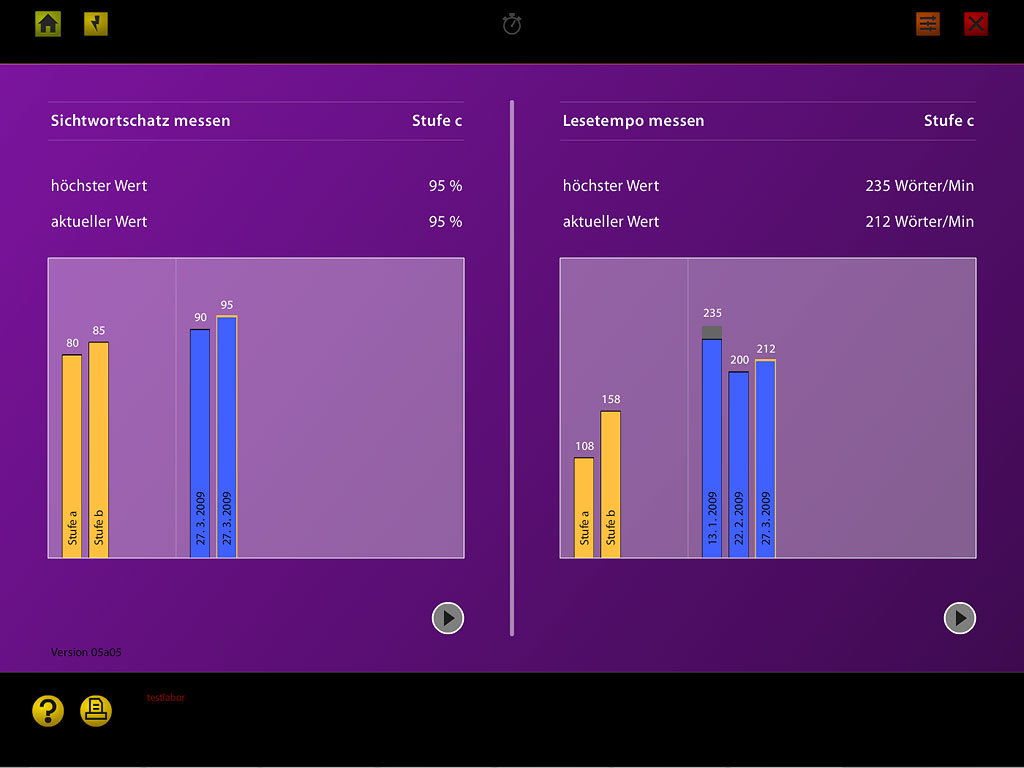Im Testlabor können die Kinder ihren Sichtwortschatz und ihr Lesetempo messen. Die Ergebnisse werden in Diagrammen dargestellt, so dass die Kinder die Entwicklung ihrer Lesefertigkeiten mitverfolgen können.